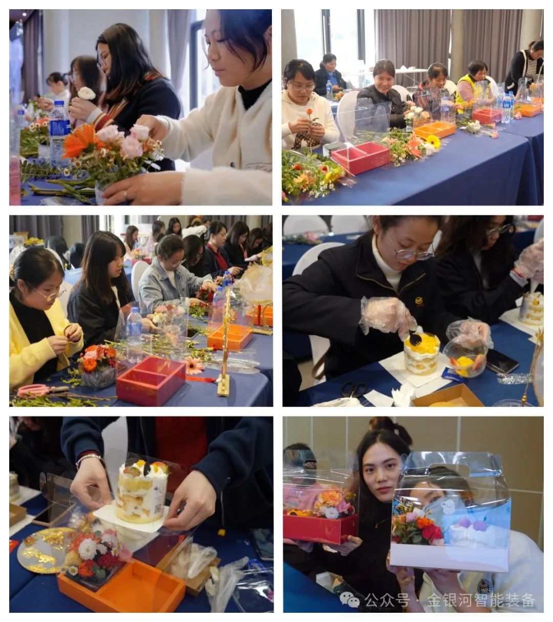 在创意蛋糕花盒的制作环节中,女职工们充分展现了她们非凡的审美能力和精湛的手艺。她们巧妙地运用灵巧的双手,将一朵朵美丽的鲜花精心插制,再与蛋糕完美结合,创作出一款款既美味可口又充满艺术美感的蛋糕花盒。